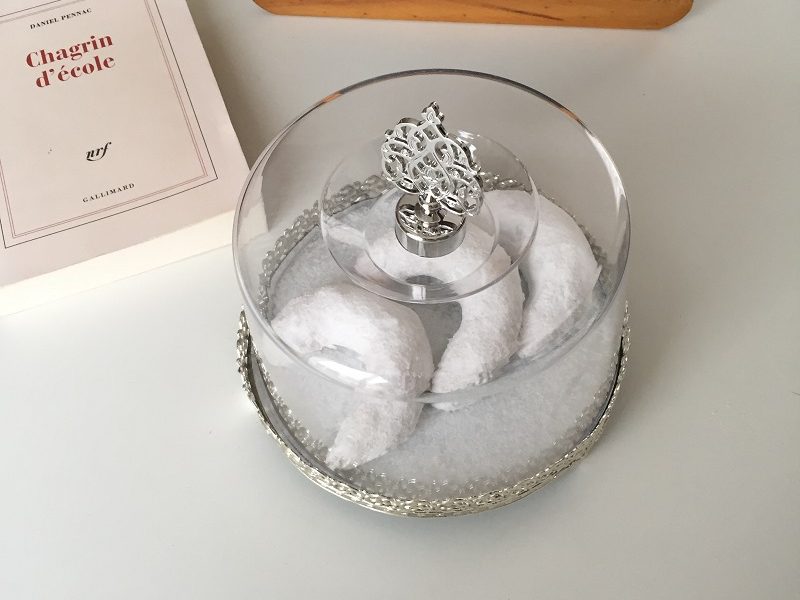 Une farce de Poudre d’Amande, parfumée à la Cannelle et à l’eau de Fleurs d’Oranger, enrobée d’une pâte fondante recouverte de Sucre Glace…